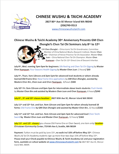 Please choose one weekend seminar: Old Frame One, or Advanced Chen Taichi Sword.